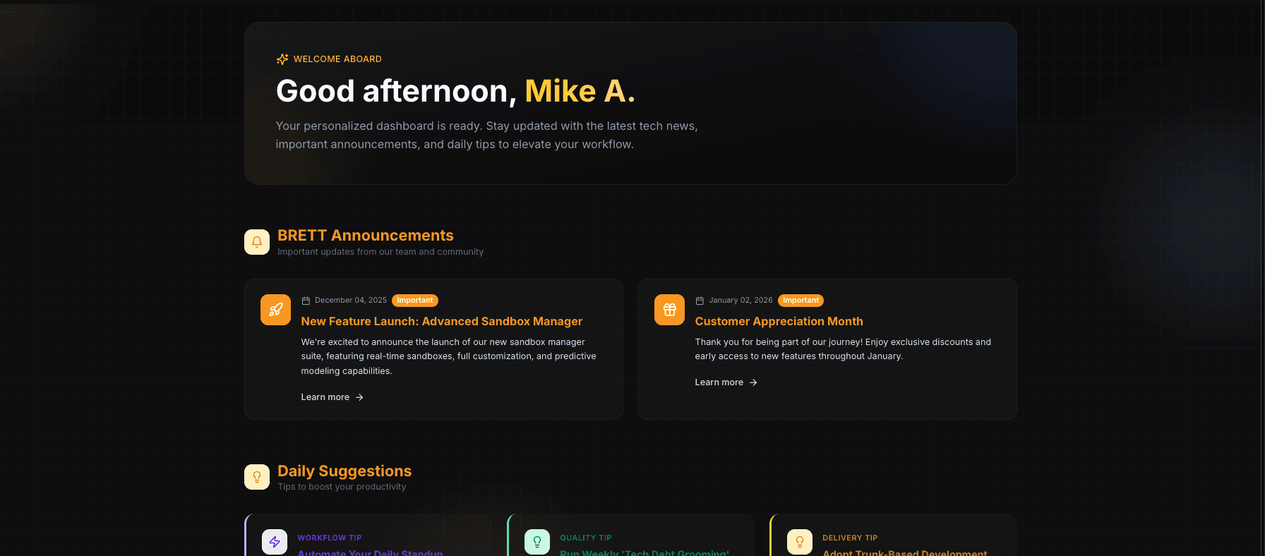 This project highlights our approach to system design, AI integration, and product development—carefully tailored to meet development teams unique goals and deliver meaningful, measurable results. BRETT is simply, The world's most powerful AI Enablement Platform. "We're building the future of AI innovation."